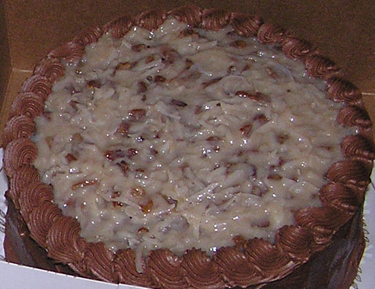 This rich moist cake is one of Adam's specialties. Like all of Adam's cakes its totally made from scratch. The cocoa beans used to make this cake were hand picked in Guatemala and carried up to Elkhart by mule. And Adam actually grinds the coconut by hand for each of the confections that bares his name. So as you can see Adam takes his German Chocolate Cakes very seriously. You have not lived until you have tried this cake!!! So if you only get one special cake this year besides all those birthday cakes for the kids, the holiday cakes, oh don't forget the office party cakes... You have to get one of these cakes. I dare you to only eat one piece!!!!!* |